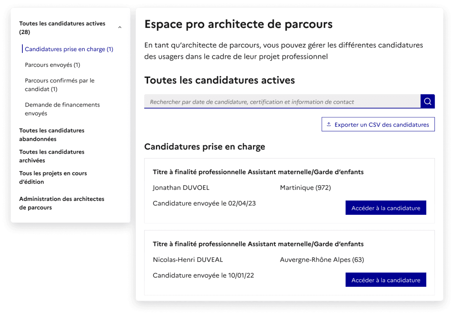 L’espace professionnel centralise le suivi de vos candidats depuis leur inscription jusqu'à leur passage devant le jury et facilite la gestion des démarches liées à la VAE :